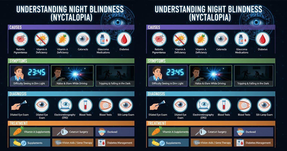 Nyctalopia, also known as night blindness, is a condition where a person has difficulty seeing in dim or dark environments. It indicates an underlying issue