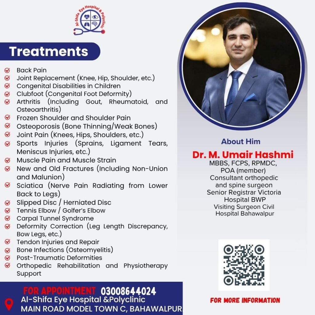 Dr. Umair Hashmi stands among the most distinguished names in Orthopedic Surgery across Bahawalpur and Southern Punjab. With years of medical excellence, he has dedicated his career to improving mobility, reducing pain, and enhancing the quality of life for his patients.